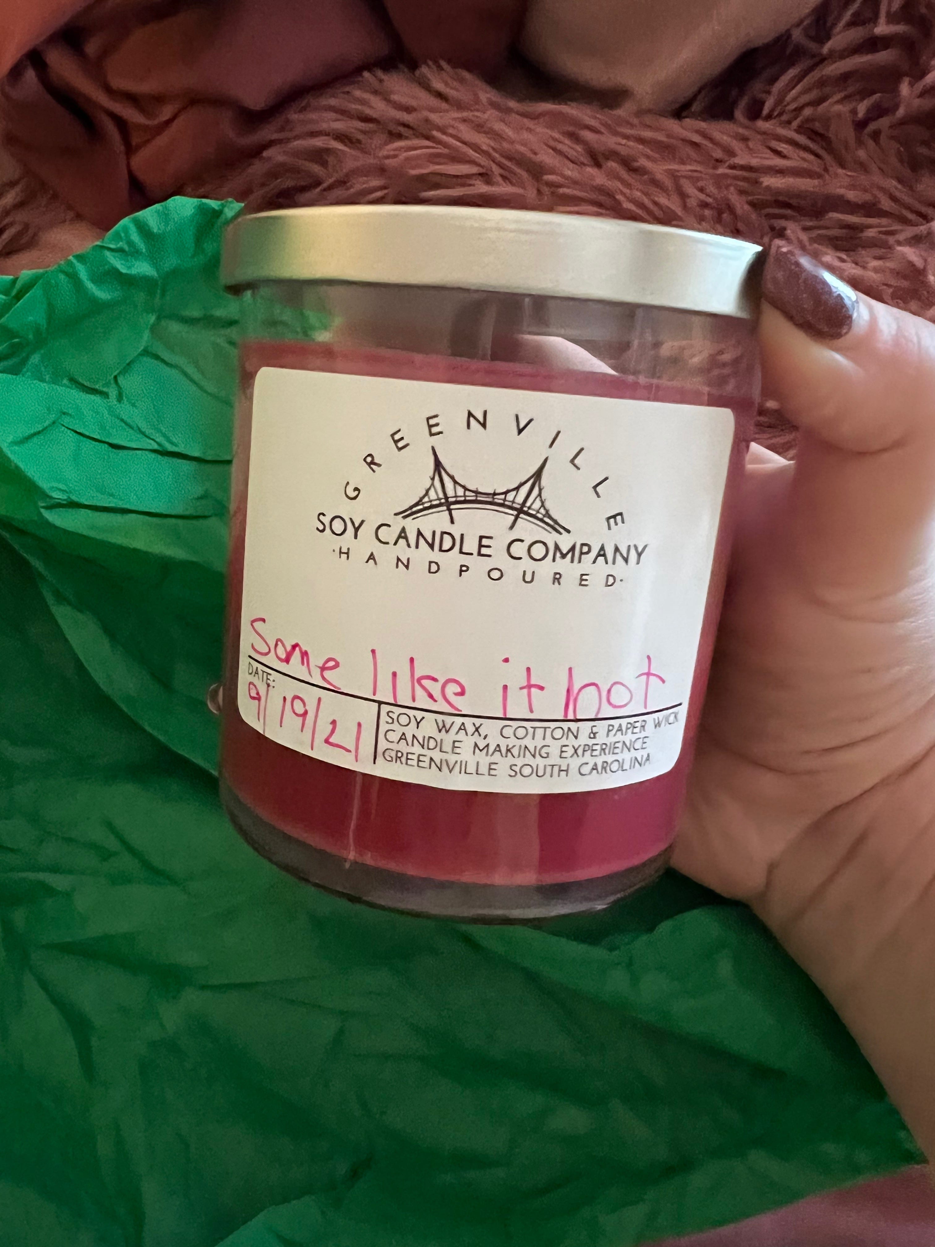 Two weeks ago, when I was in Greenville, South Carolina for Euphoria, my fab friend Amanda set me up with a candle-making class at Greenville Soy Candle Company. We got to make our own candles, choose the colors, scents, even name it. So, I made my departing friend Kristin a surprise candle as her going away gift.