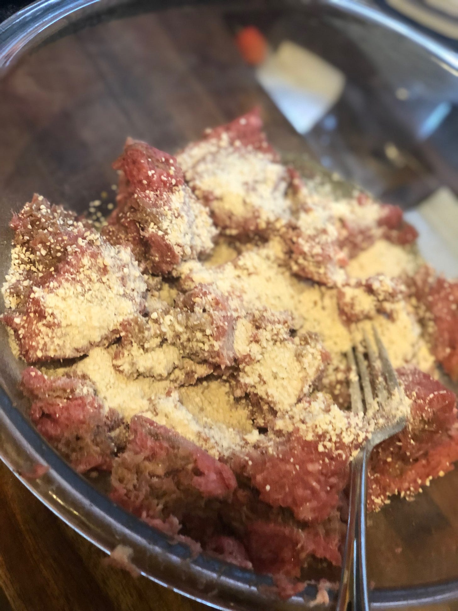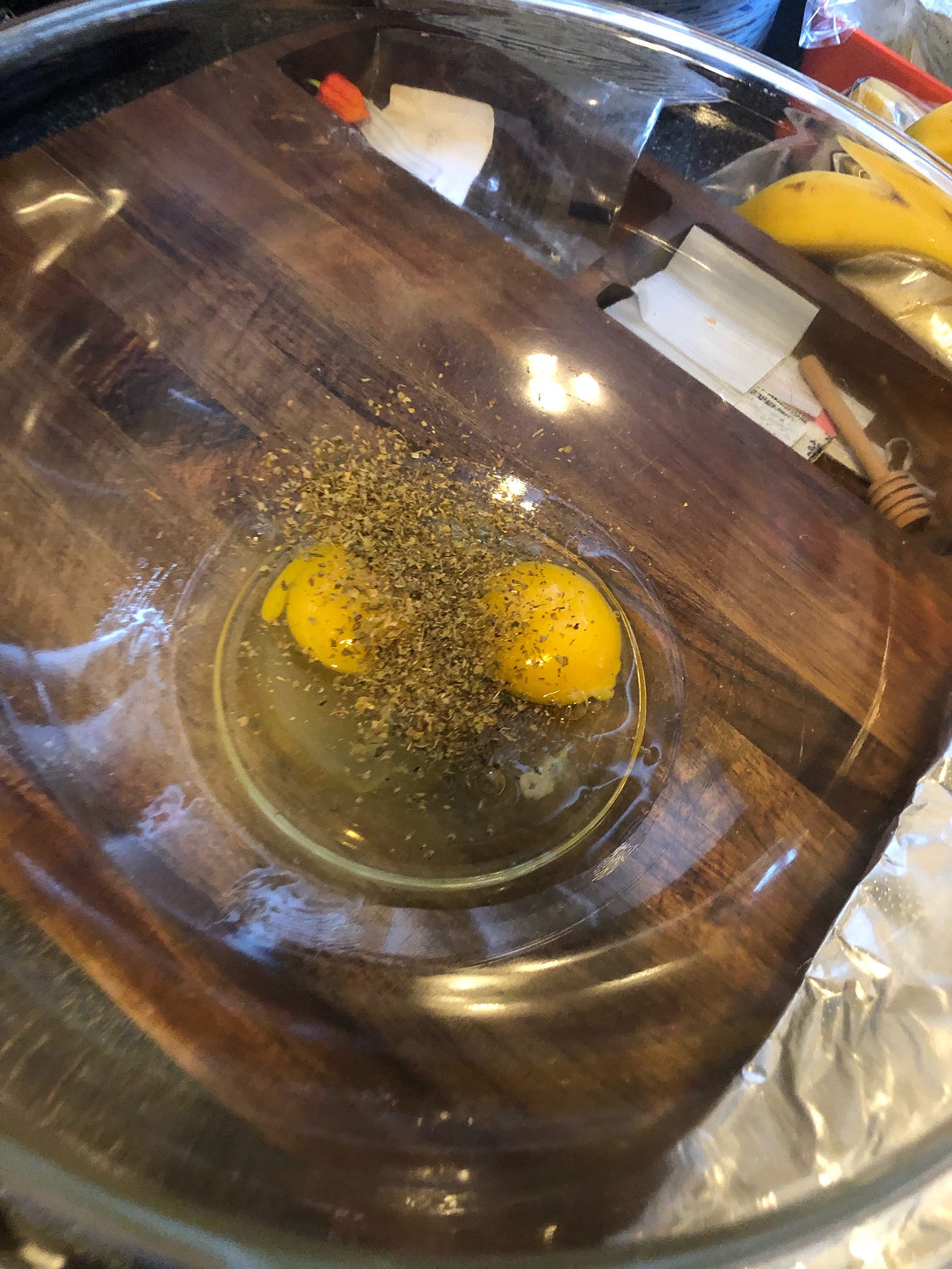 1. Start out by putting one egg per pound of ground meat you will be using into a bowl, add a capful of Italian seasoning blend (if it's me at home I also add a tbsp of chili flakes at this point, but not doing this today.)
