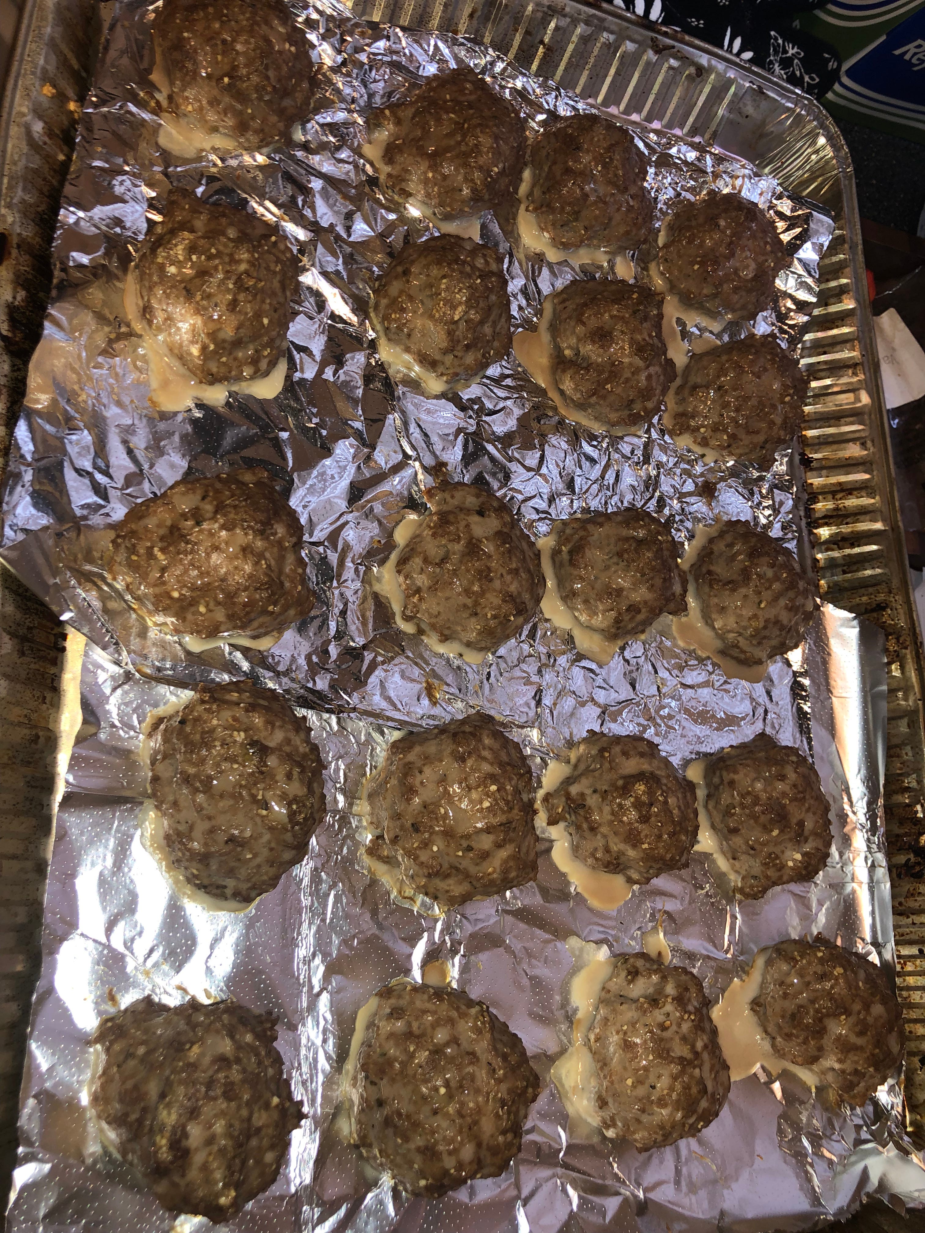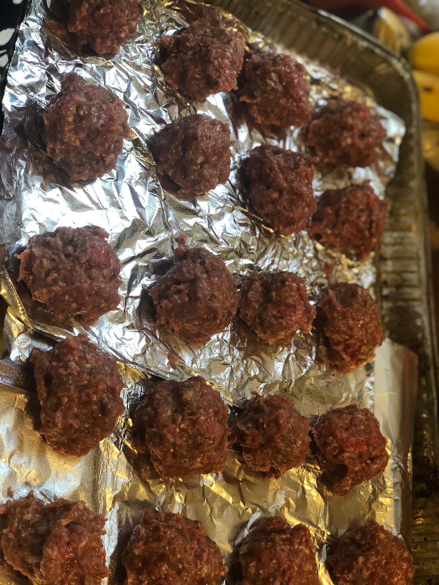 This is the whole meat mixture! Now make your balls. Here's my hack - we're going to take these balls and put them on a tray and put them in the oven for 20 minutes at 400 degrees.