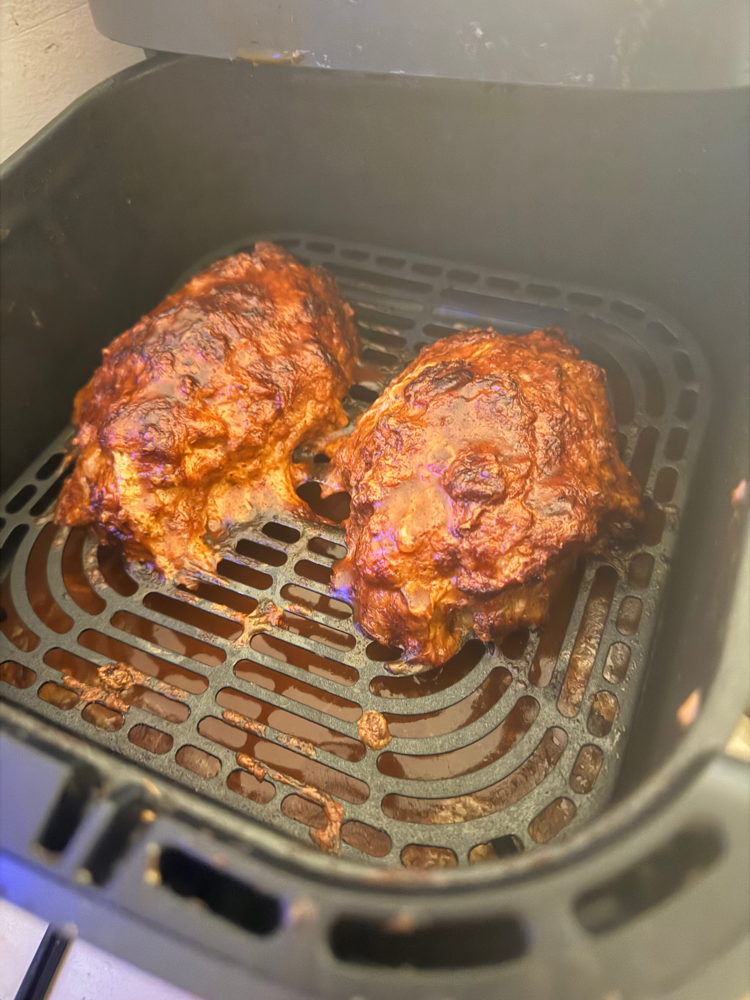 Set your air fryer to 350°F (Preheat too if you can!). You. may want to make a boat of aluminum foil under your loaves to catch any grease and avoid smoking (or you can reserve those drippings to make a gravy after, up to you!)