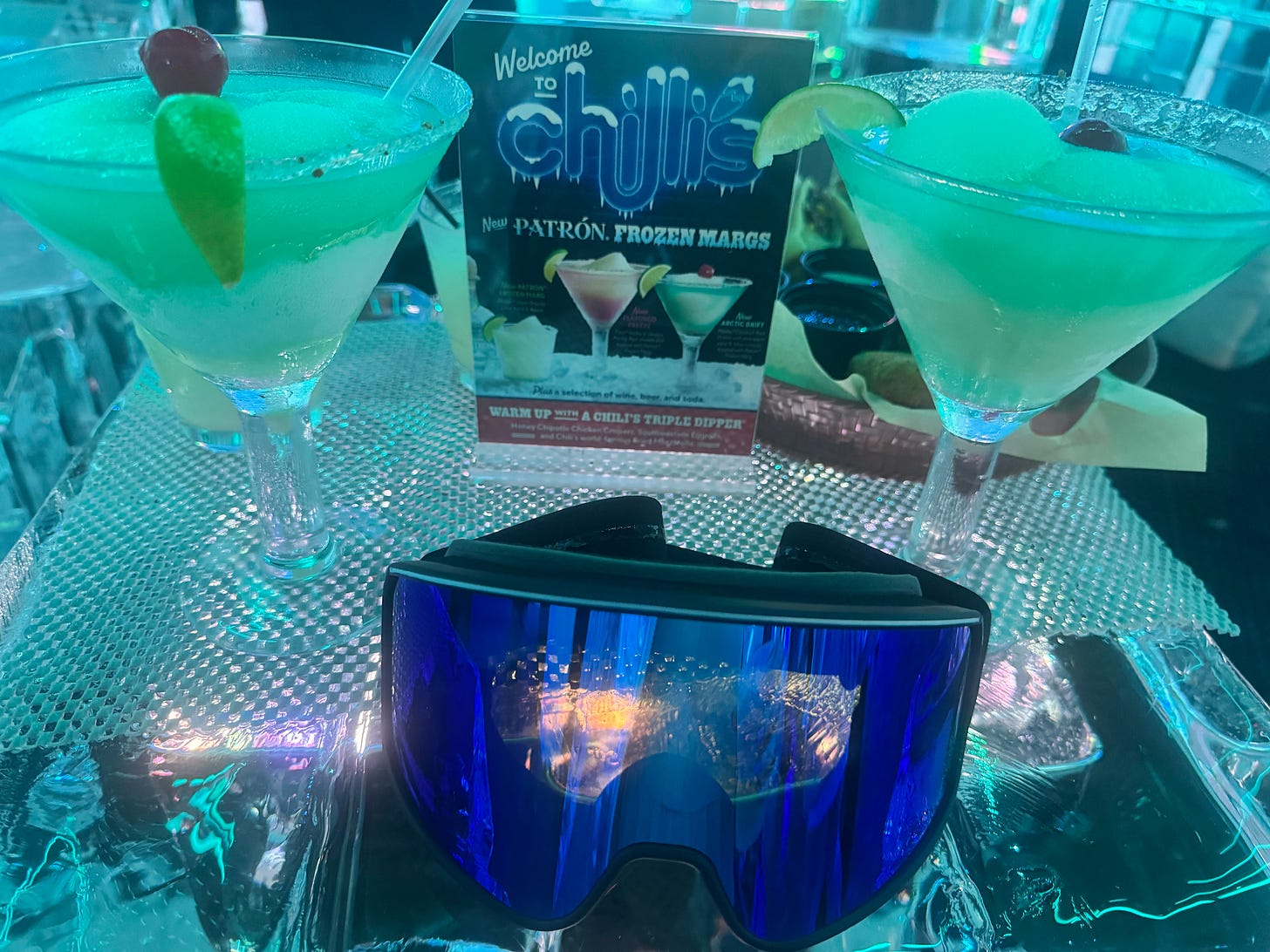 Chili’s hosted a “chilly” (haha, get it!) event to showcase their new margarita lineup, and they did it in the backdrop of a completely igloo-like room, complete with bars and tables made of ice, super-cold temps, and frozen cocktails. The room was so cold they handed out bomber jackets (that you could have inscribed with your name), gloves, and beanie hats…